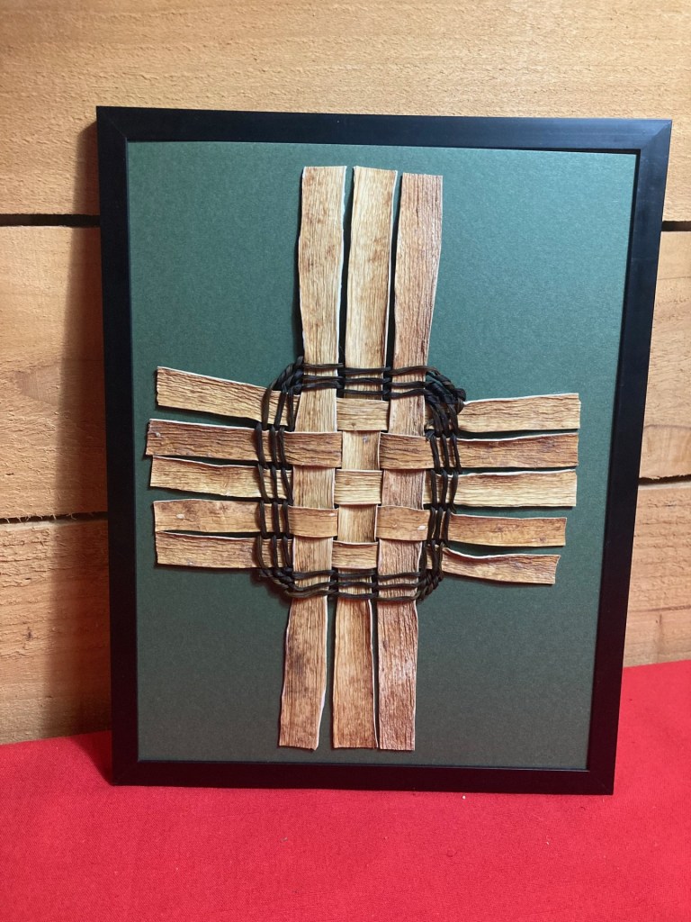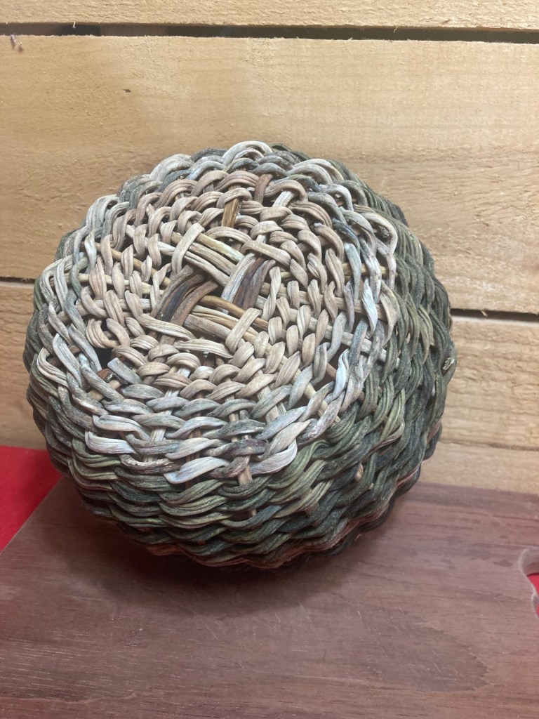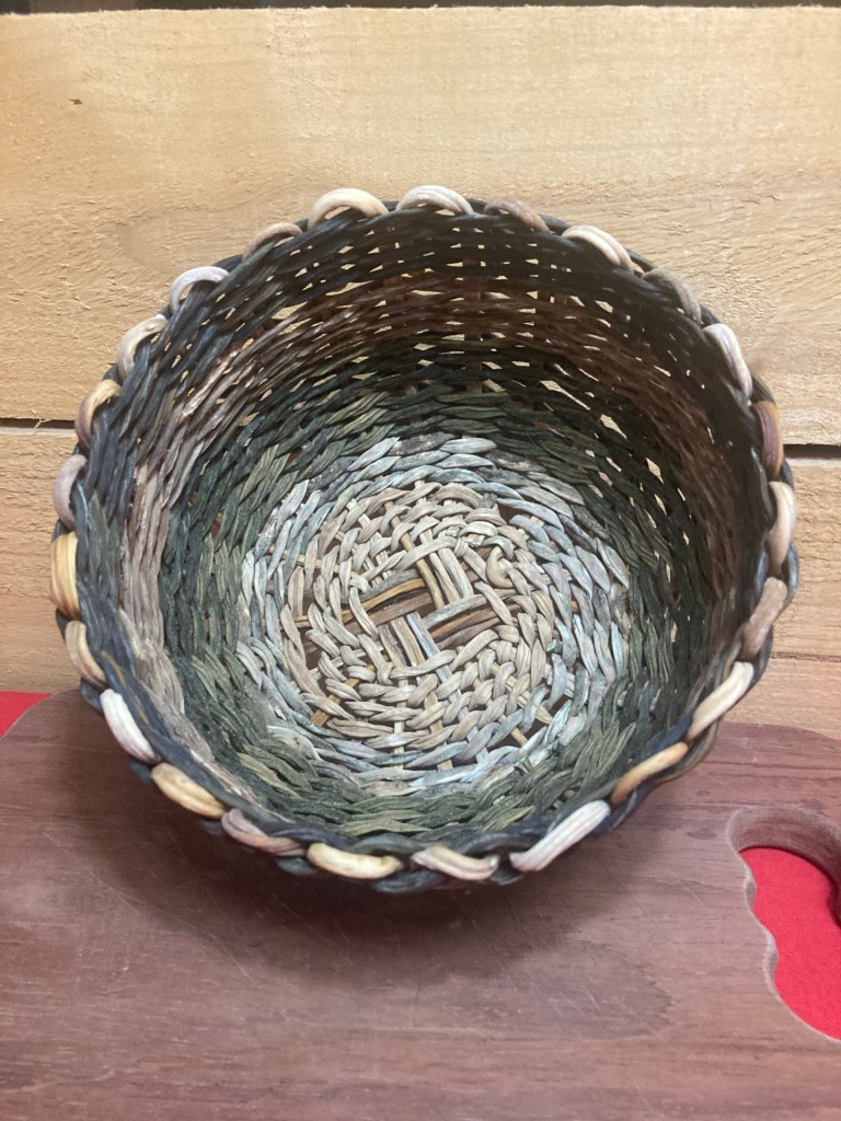 Several kelp species attach to rocks or hard substrates in deeper near shore marine waters along the Pacific coast. The stipes, or stems, can grow up to 10 to 80 feet long as the plants reach for light at the water’s surface. Bull kelp (Nereocystis) occurs from Alaska to near Santa Barbara California, Elk kelp (Pelagophycus) occurs from the Channel Islands near Santa Barbara California to San Benito in Baja California, Giant Kelp (Macrocystis) occurs as the very large kelp beds observed along the southern California kelp beds from near San Francisco into central Baja California. The kelp material used to make kelp baskets is the fibrous cell wall material of the stipes. It is obtained from the plants that have broken free of their holdfast substrate during rough seas at the end of its life cycle and has been cast up onto the shore where it begins to naturally decompose. Color variations in the baskets result from the amount of time the material has been exposed to the sun on the shore before being collected.